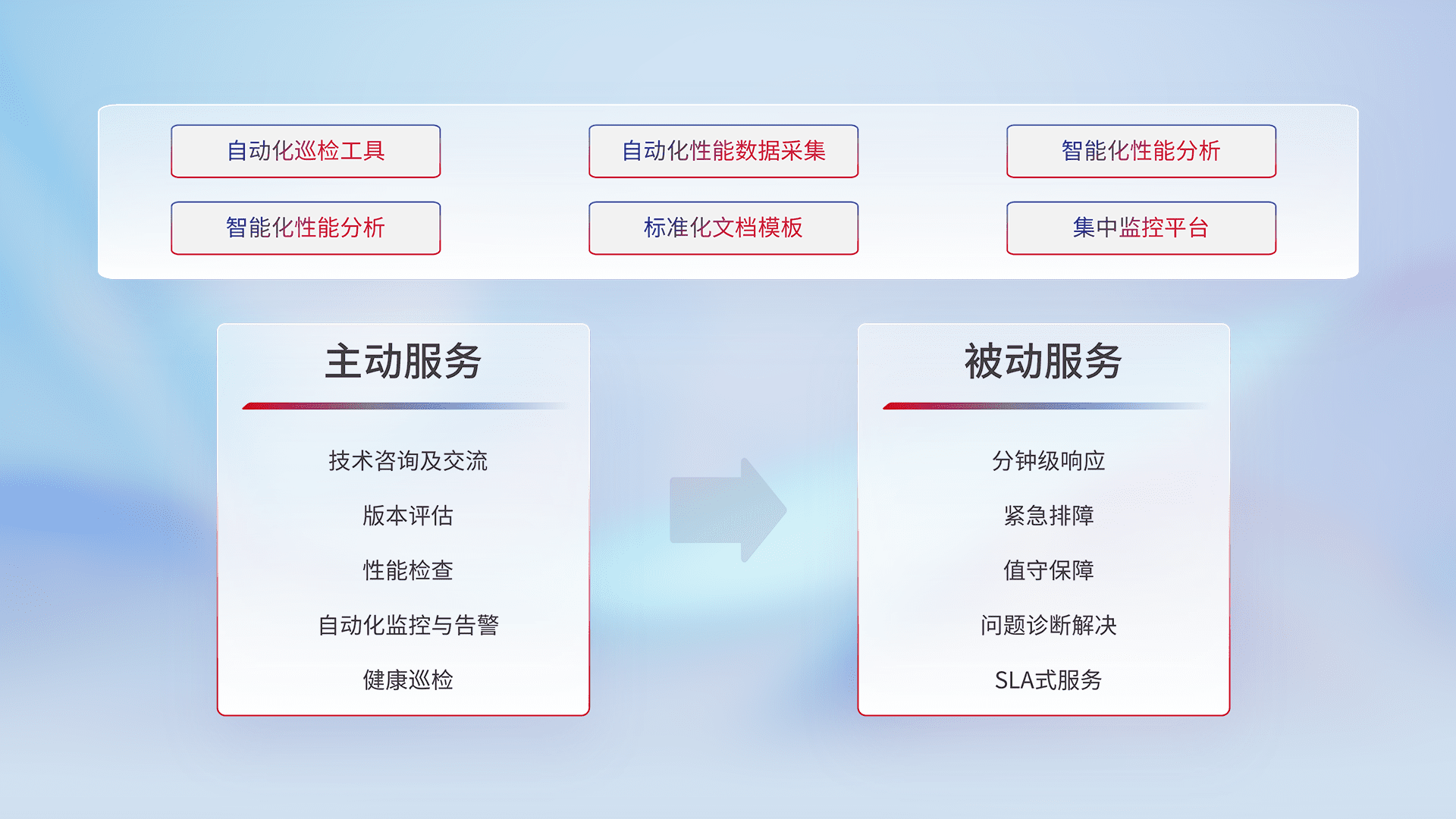 智能化工具和标准化文档,,,,保障服务质量,,,,提供主动服务(包含技术咨询、、版本评估、、、性能检查、、自动化监控与告警、、、健康巡检)和被动服务包含(分钟级响应、、紧急排障、、值守保障、、问题诊断解决、、SLA服务)。。