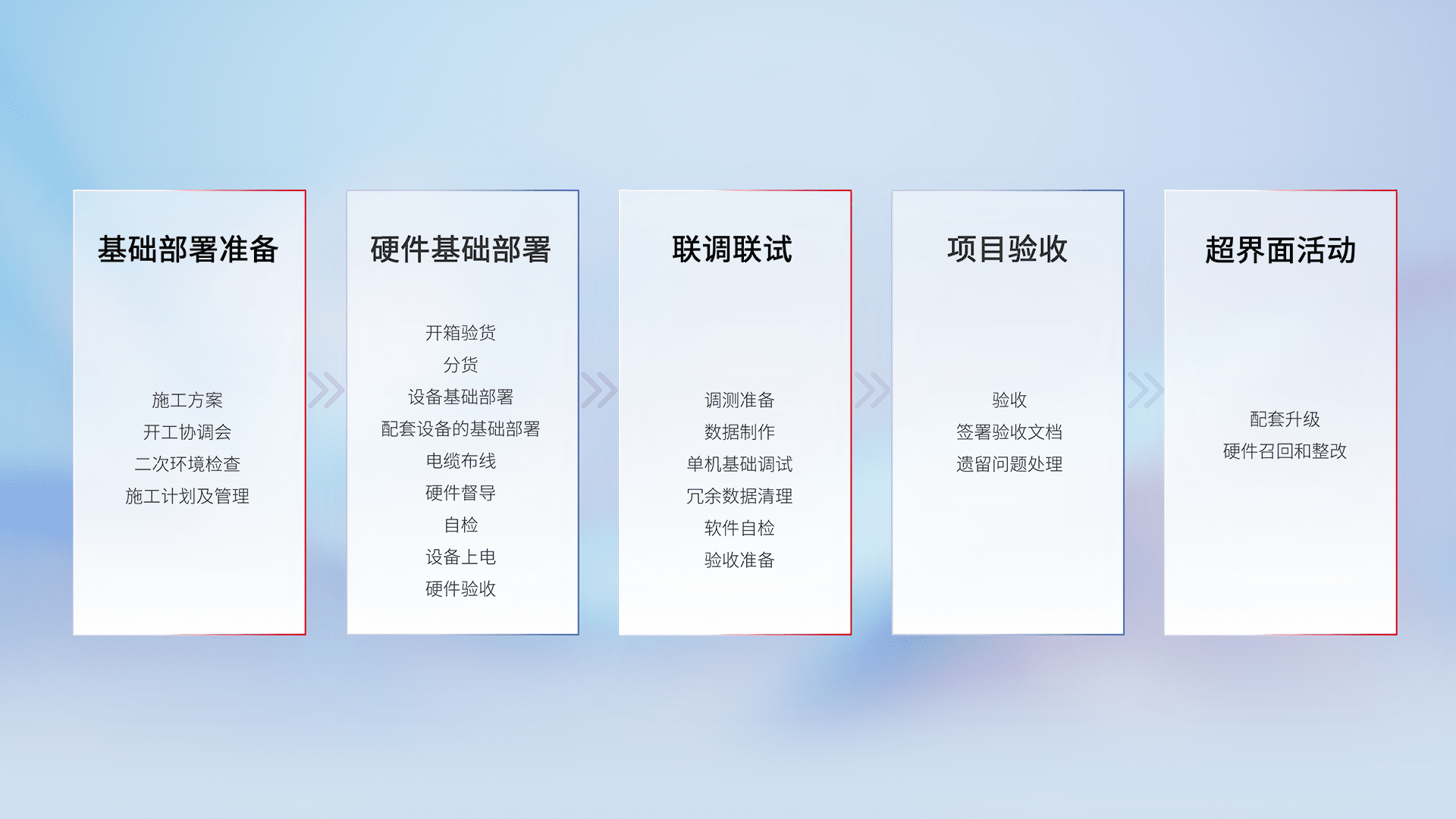 从基础部署准备、、硬件基础部署、、、、联调联试、、、、项目验收、、、越界面活动的全过程可追溯,,,,保证施工质量和进度。。